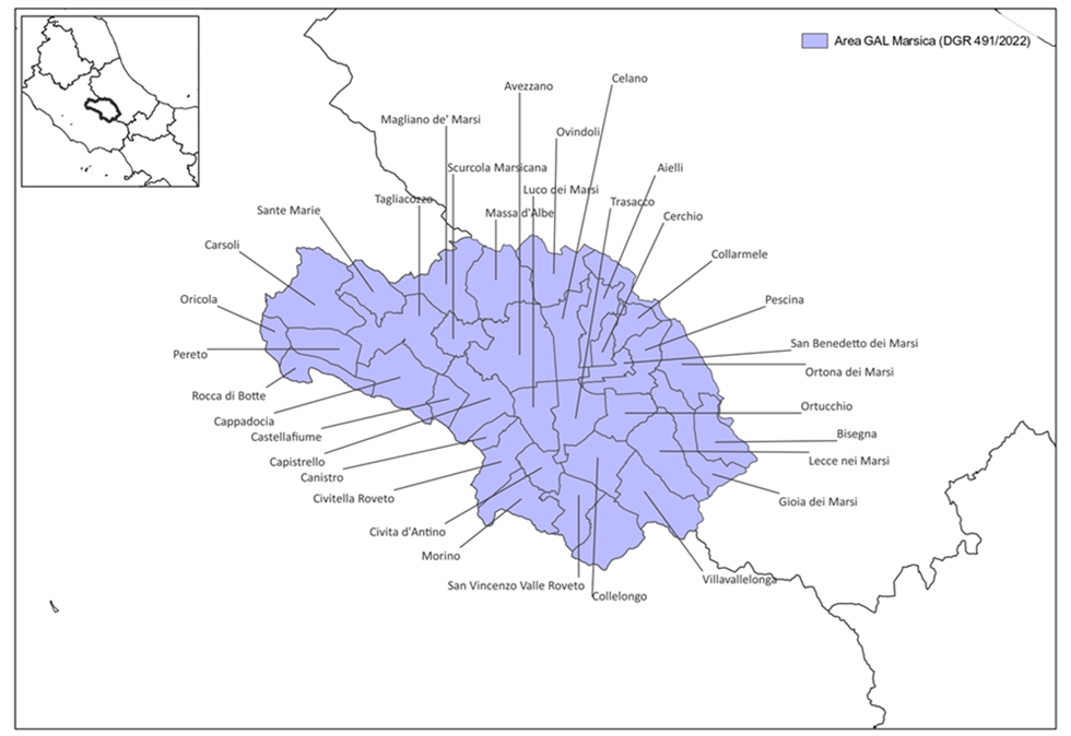 Area MARSICA: Aielli, Avezzano, Balsorano, Bisegna, Canistro, Capistrello, Cappadocia, Carsoli, Castellafiume, Celano, Cerchio, Civita d'Antino, Civitella Roveto, Collarmele, Collelongo, Gioia dei Marsi, Lecce nei Marsi, Luco dei Marsi, Magliano de’ Marsi, Massa d'Albe, Morino, Oricola, Ortona dei Marsi, Ortucchio, Ovindoli, Pereto, Pescina, Rocca di Botte, San Benedetto dei Marsi, Sante Marie, San Vincenzo Valle Roveto, Scurcola Marsicana, Tagliacozzo, Trasacco, Villavallelonga.
